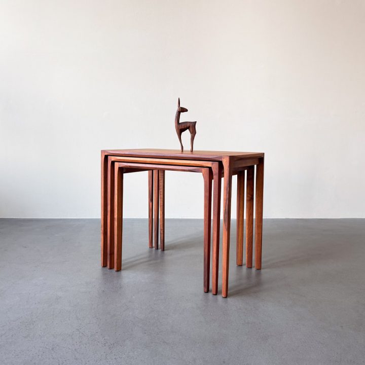 Dieses dreiteilige Satztisch-Set wurde in den 1950er Jahren vom britischen Architekten und Designer Rex Raab für Wilhelm Renz KG entworfen. Charakteristisch sind die fein modellierten, pentagonal geformten Beine und die schlanken Massivholzumrandungen, welche die beidseitig furnierten Tischplatten fassen. Die hochwertige Verarbeitung zeigt sich besonders in den warmen, gleichmäßigen Farbtönen des Nussbaumholzes und der sorgfältigen handwerklichen Ausarbeitung aller Kanten und Übergänge.