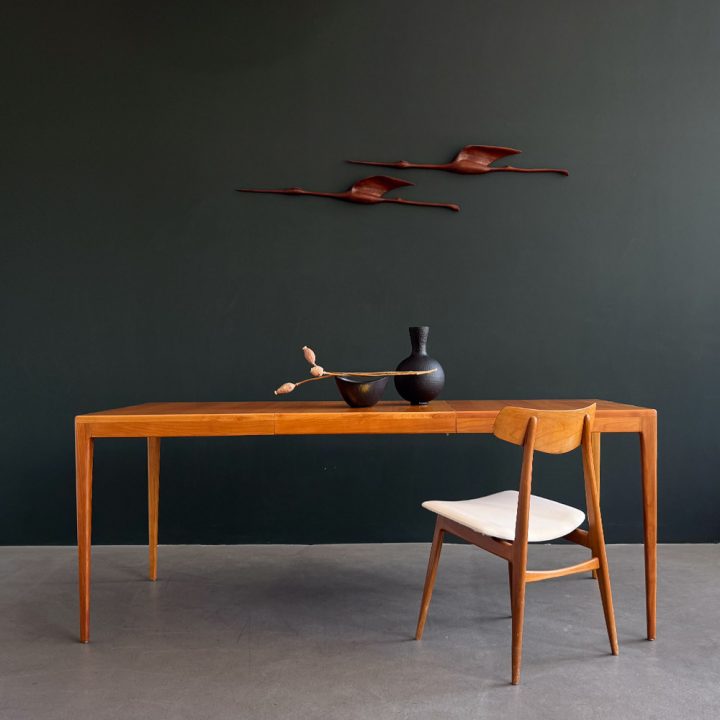 Der Entwurf dieses Esstisches von Hartmut Lohmeyer aus den späten 1950er Jahren zeigt eine Form von Klarheit, die nicht auf Reduktion allein setzt, sondern auf Präzision im Detail. Stabilität wird hier nicht über Masse erreicht, sondern über Proportion und konstruktive Genauigkeit.