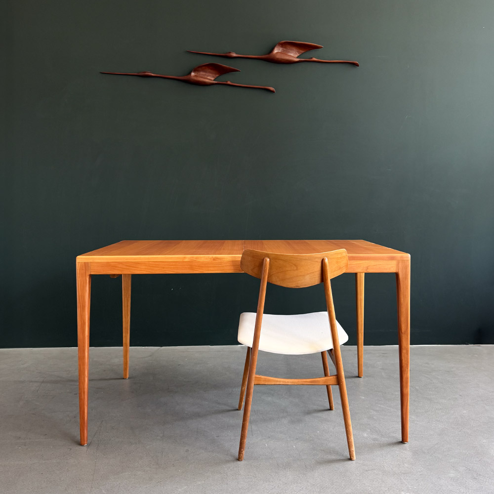Die Tischplatte ist in Kirschholz furniert und von einer umlaufenden Massivholzkante eingefasst, die dem Möbel nicht nur Stabilität verleiht, sondern zugleich eine feine optische Fassung bildet. Das Gestell greift diese Materialität konsequent auf und ist ebenfalls in Kirschholz ausgeführt. Die weich gerundeten Übergänge von Zarge zu Bein sind nicht angesetzt, sondern fließend aus der Konstruktion heraus entwickelt.