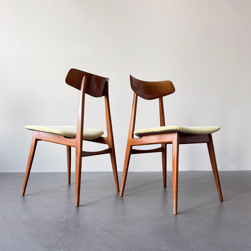 Die schlank konzipierten Habeo Stühle zeigen eine zurückhaltend organische Formensprache der 1950er Jahre, geprägt von konisch zulaufenden Beinen und einer weich geformten Rückenlehne. Die Gestaltung wirkt leicht und ausgewogen, funktional.