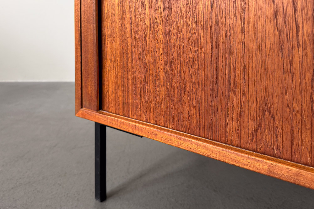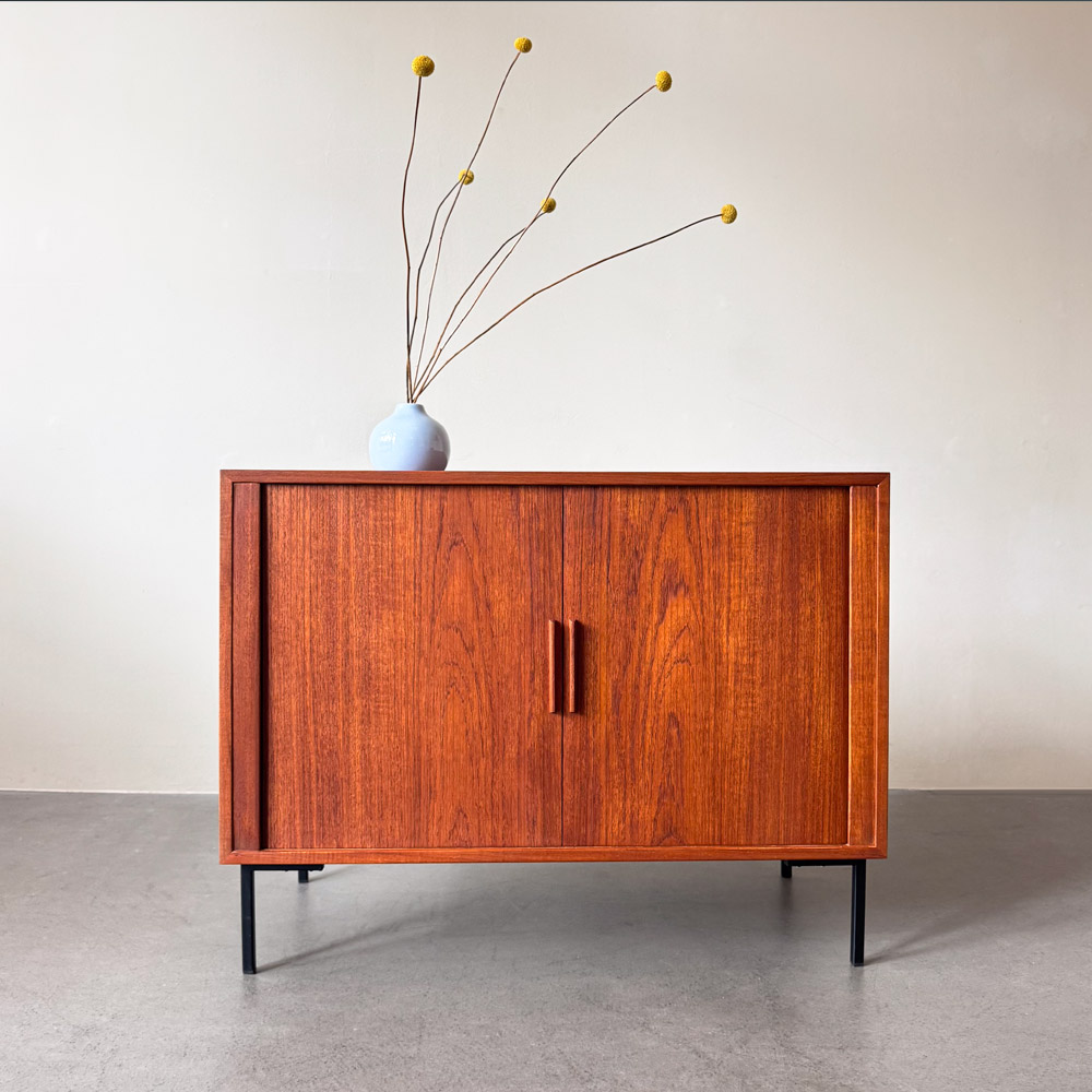 Typisch für Kristiansen verbindet der Entwurf klare Linien, funktionales Design und handwerkliche Präzision – sichtbar in den seltenen, präzise gearbeiteten Tambourtüren, die sich seitlich öffnen und eine durchlaufende, harmonisch verlaufende Holzmaserung über die gesamte Front zeigen.