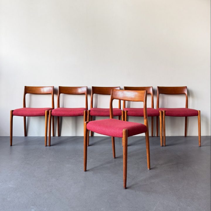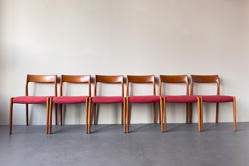 Sechs Stühle des Modells 77 von Niels Otto Møller für J.L. Møllers Møbelfabrik aus Dänemark befinden sich derzeit in der Aufarbeitung. Das Modell steht für eine klare, reduzierte Formensprache, ausgewogene Proportionen und eine hochwertige handwerkliche Ausführung.