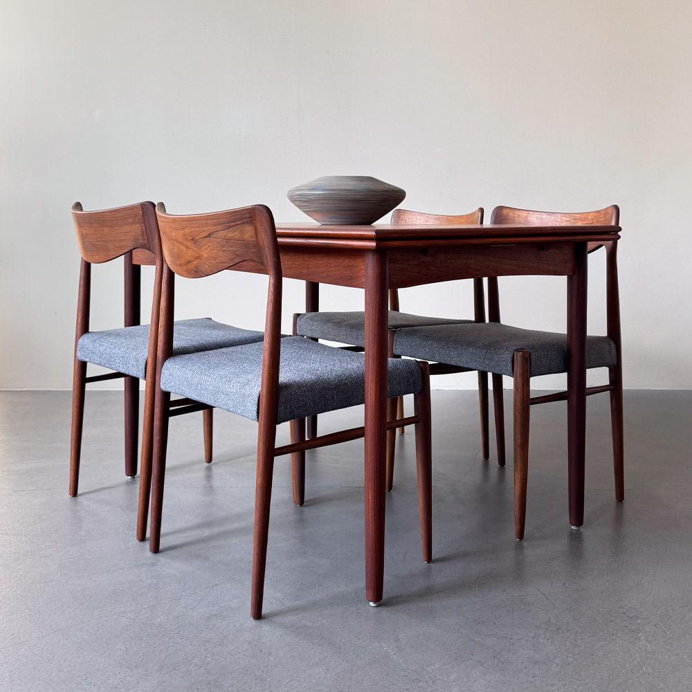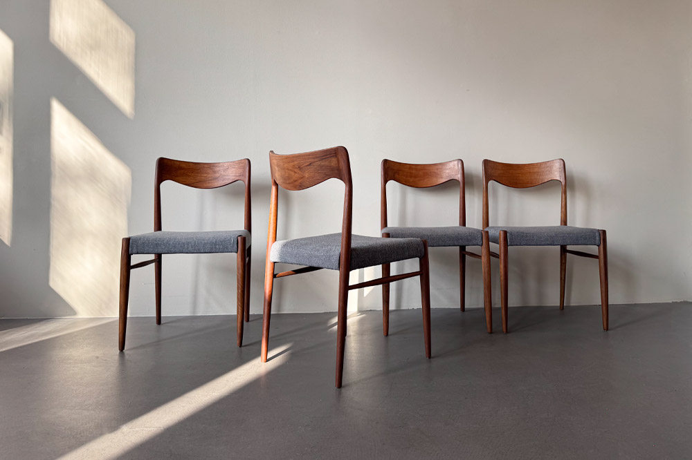 Vier Teakstühle mit einer ruhig entwickelten, außergewöhnlich stimmigen Form, deren besondere Qualität sich in den fließenden Übergängen und der harmonischen Proportion zeigt. Der Entwurf wird häufig Niels O. Møller zugeschrieben, eine gesicherte Zuordnung lässt sich jedoch nicht belegen – die Qualität der Ausführung spricht dennoch für eine Herkunft aus dem gehobenen skandinavischen Kontext der 1960er Jahre.
