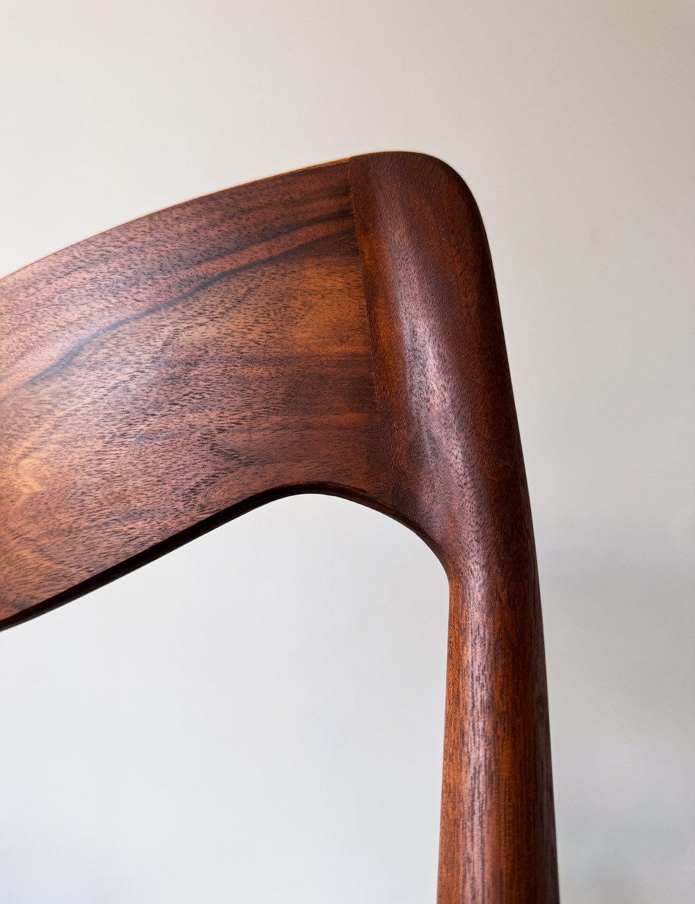 Die Rückenlehnen sind aus massivem Teak gearbeitet und zeigen eine weich gespannte, organische Linie, die sich nahezu nahtlos in die hinteren Beine fortsetzt. Diese durchgehende Linienführung erzeugt eine ruhige, spannungsvolle Form, die ohne harte Übergänge und ohne dekorative Zusätze auskommt.