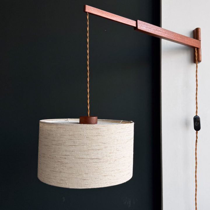 Der horizontale Arm lässt sich stufenlos ausziehen und ermöglicht eine flexible Anpassung der Ausladung – ideal auch als Leseleuchte neben Sofa oder Bett. Die Konstruktion ist präzise gearbeitet, die Führung sauber in das Holz eingelassen. Die sichtbare Textilkordel wird durch den Arm geführt und bleibt als bewusstes Detail Teil der Gestaltung